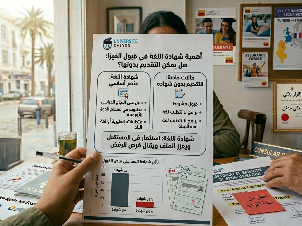 أهمية شهادة اللغة في قبول الفيزا: هل يمكن التقديم بدونها؟ by admin مرايا فكرية تُعتبر شهادة اللغة من العناصر الأساسية في ملف التأشيرة، خاصة في الدول الأوروبية. فهي دليل على قدرة الطالب على متابعة دراسته بنجاح.في معظم الحالات، يُطلب تقديم شهادة مثل الإنجليزية أو لغة البلد. عدم توفر هذه الشهادة قد يؤدي إلى رفض الطلب، حتى لو كان القبول الجامعي موجودًا.ومع ذلك، هناك بعض الحالات التي يمكن فيها التقديم بدون شهادة لغة، مثل الحصول على قبول مشروط، أو الدراسة في برامج لا تتطلب لغة في البداية.لكن رغم ذلك، تبقى شهادة اللغة عاملًا مهمًا يعزز الملف ويزيد من فرص القبول بشكل كبير.لذلك، يُنصح الطلاب التونسيون بالاستعداد مسبقًا واجتياز اختبار لغة معترف به، لأنه يمثل استثمارًا حقيقيًا في مستقبلهم الدراسي.